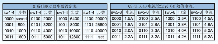 QS-3H504D型驱动器,主要用于驱动57型三相混合式步进电机,通过拨码开关的5-8位可以设定16档电机电流输出(参见下方右侧表),最大电流5.2A(有效值)。本驱动器采用直流DC(24-40)V供电,建议使用开关电源供电,其供电功率建议不小于100W。
