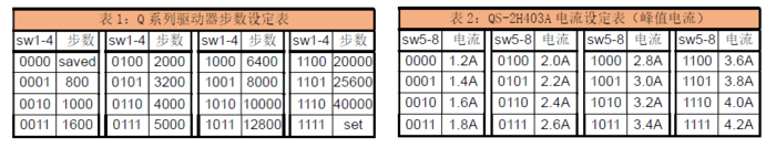 如果上表的14档步数已经满足要求,此节可忽略。Q系列驱动器有多达255档的步数可供选择,这样很方便适配设备的传动轴比。但上表中只有14档,其它的步数怎样使用呢?方法是,先把你选定的步数存储在驱动器内,使用前把sw1-4拨至0000即可。参见下表根据选定的步数找到对应的K1和K2,然后按以下步骤设定(保存的步数掉电不会丢失,故只需设定一次):