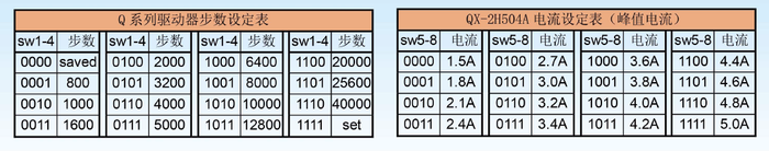 可以提供255 档步数选择,最大步数51000,有14档步数可以通过拨码开关的1-4位直接使用(参见下方表1),其它步数设定参见【步数及设定]。本型号具有Q系列驱动器的所有功能,参见【功能及设定]。